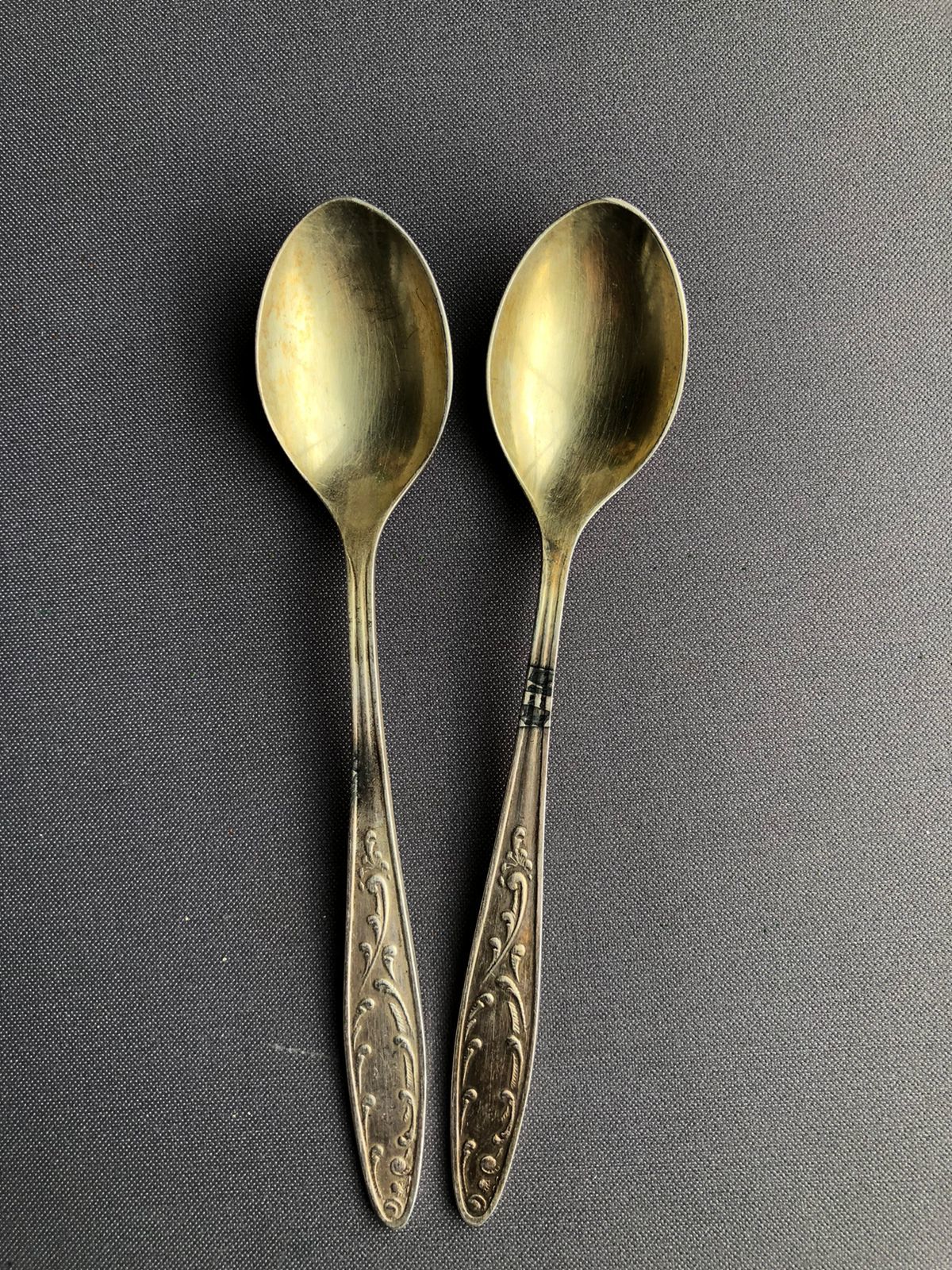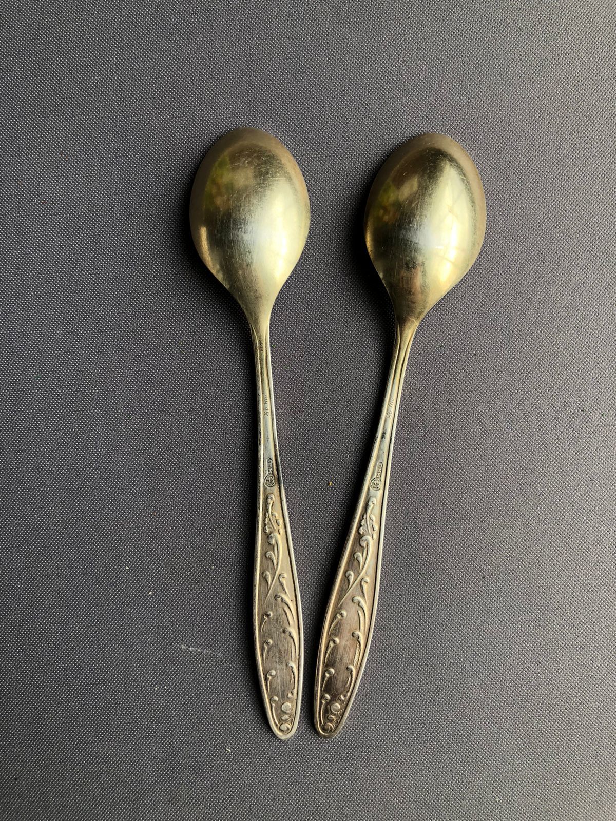 K14324 Ложка чайная мельхиор СССР Кольчугино МНЦ 140х26 мм 2 шт. посеребрение позолочение