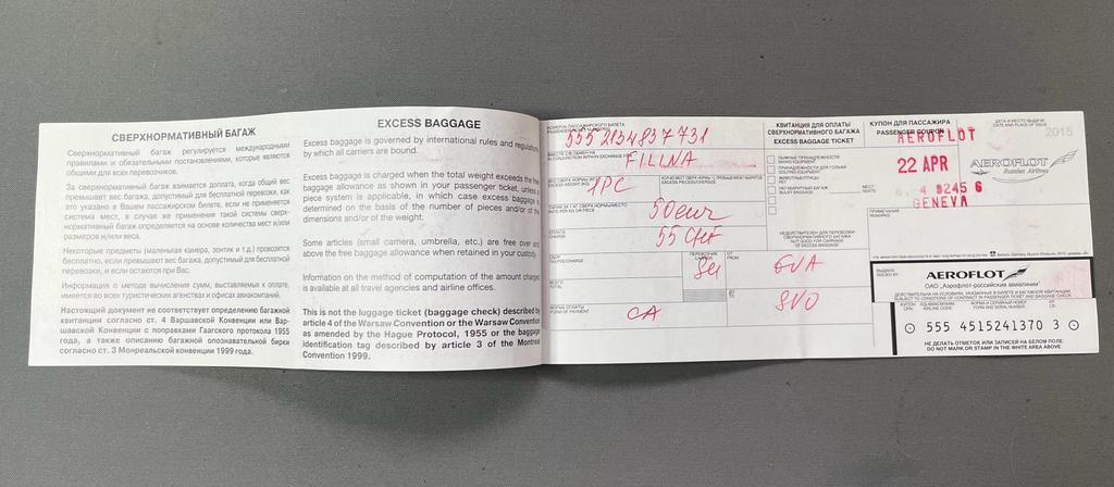 K15609 Билет книжка Аэрофлот 2015 г. Женева-Москва