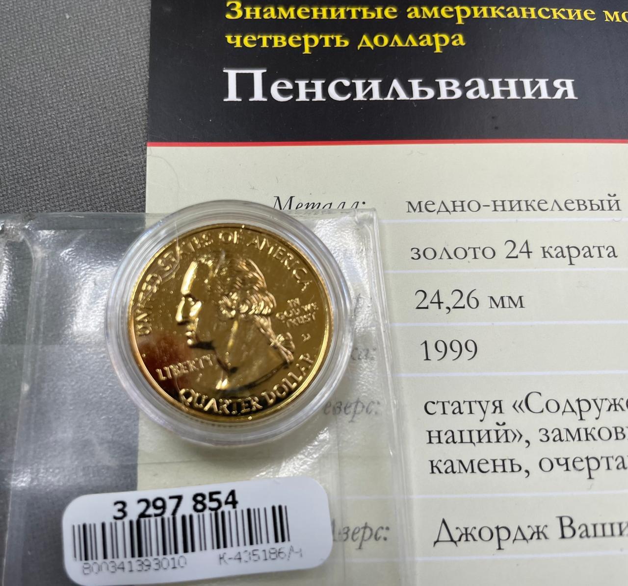 K15881 США 25 центов 1999 Пенсильвания Штат США Статуя Содружество наций Двор P Квотер Позолота 24 к.